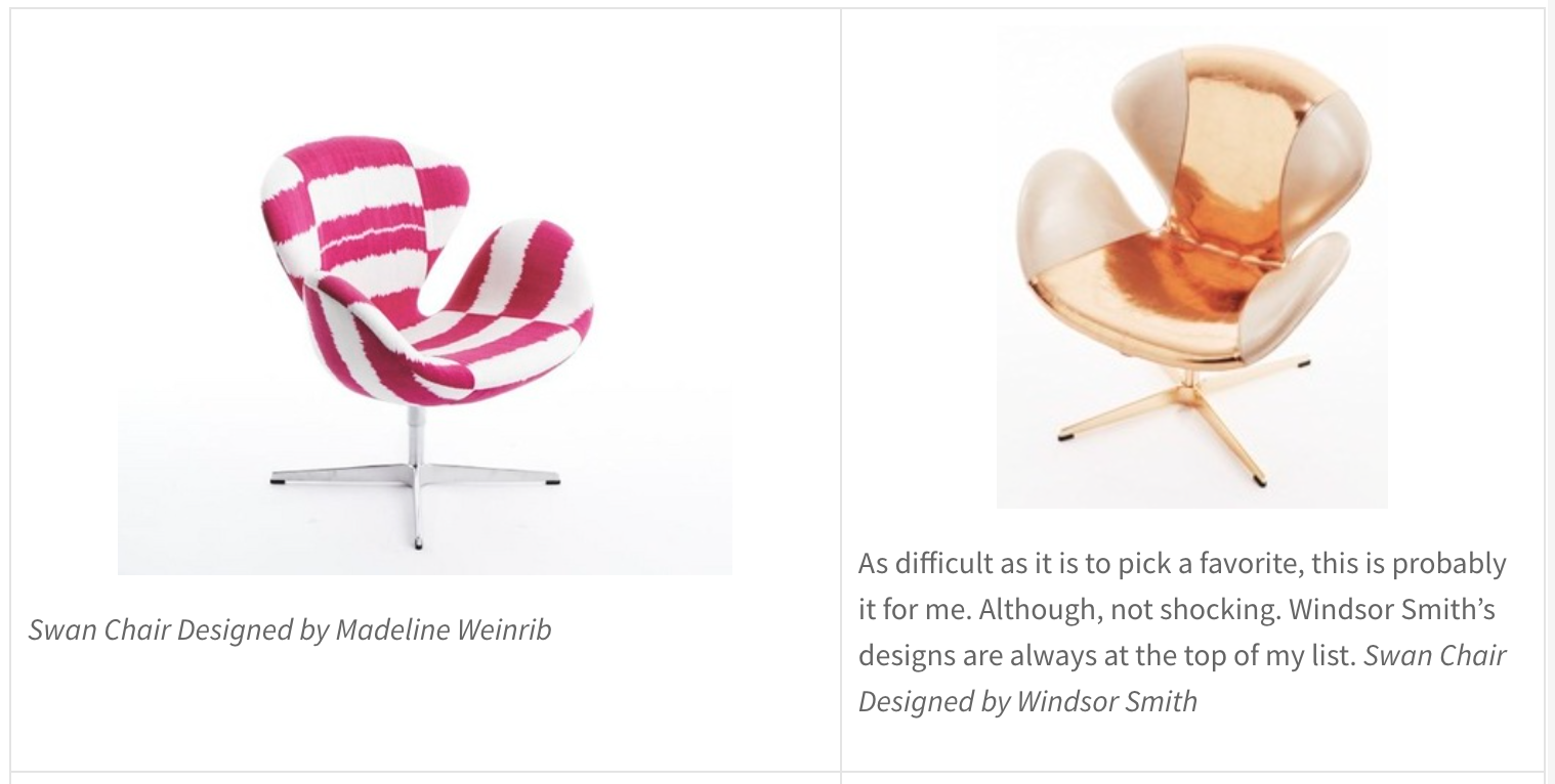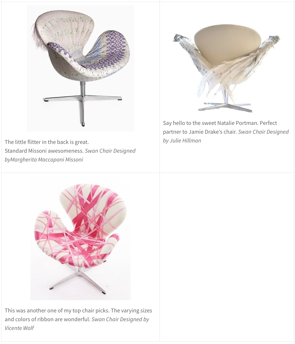 Following up on their successful Pink Wishbone Project, SUITE New York has launched it’s second year benefit, The Pink Swan Project. I have to tell you, when I first saw these chairs, I thought I had died and gone to heaven. Not only has SUITE gotten nineteen fabulous designers to put their own spin on the classic Swan Chair, but they are just so darn pretty. For the entire month of October, National Breast Cancer Awareness Month, SUITE New York will be auctioning off these amazing chairs, with 80% of the proceeds going to The Breast Cancer Research Foundation. So, in a nutshell, you donate to a very worthy cause and you get a seriously beautiful, one-of-a-kind chair by a famous designer. It’s a win, win!
