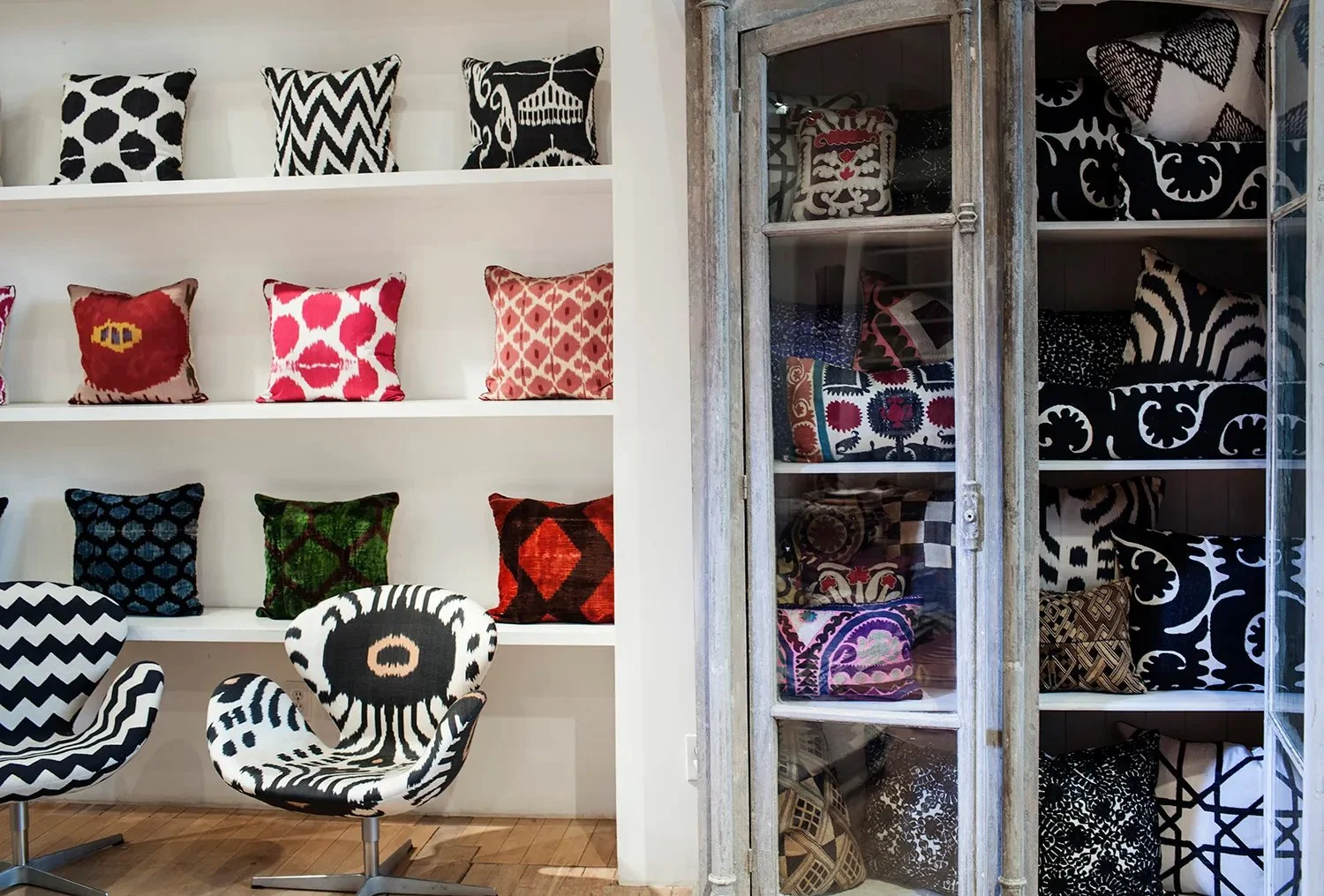 Madeline’s Pillow wall featuring silk ikat and velvet ikat pillows (Photo: Andrea Chu for Observer).